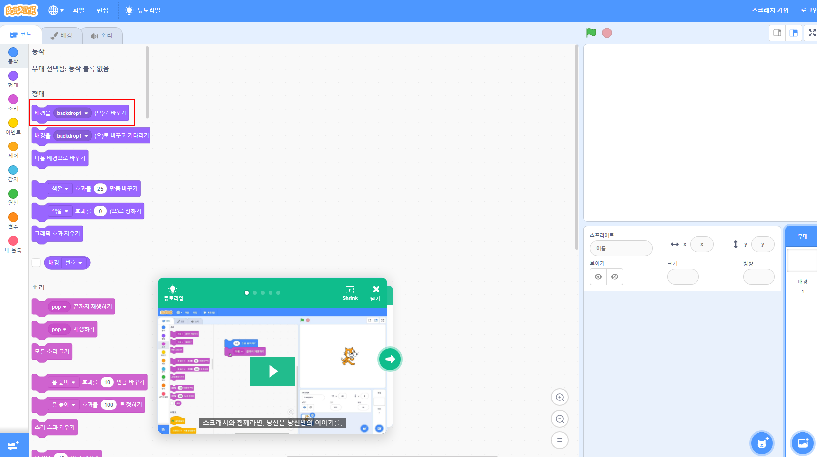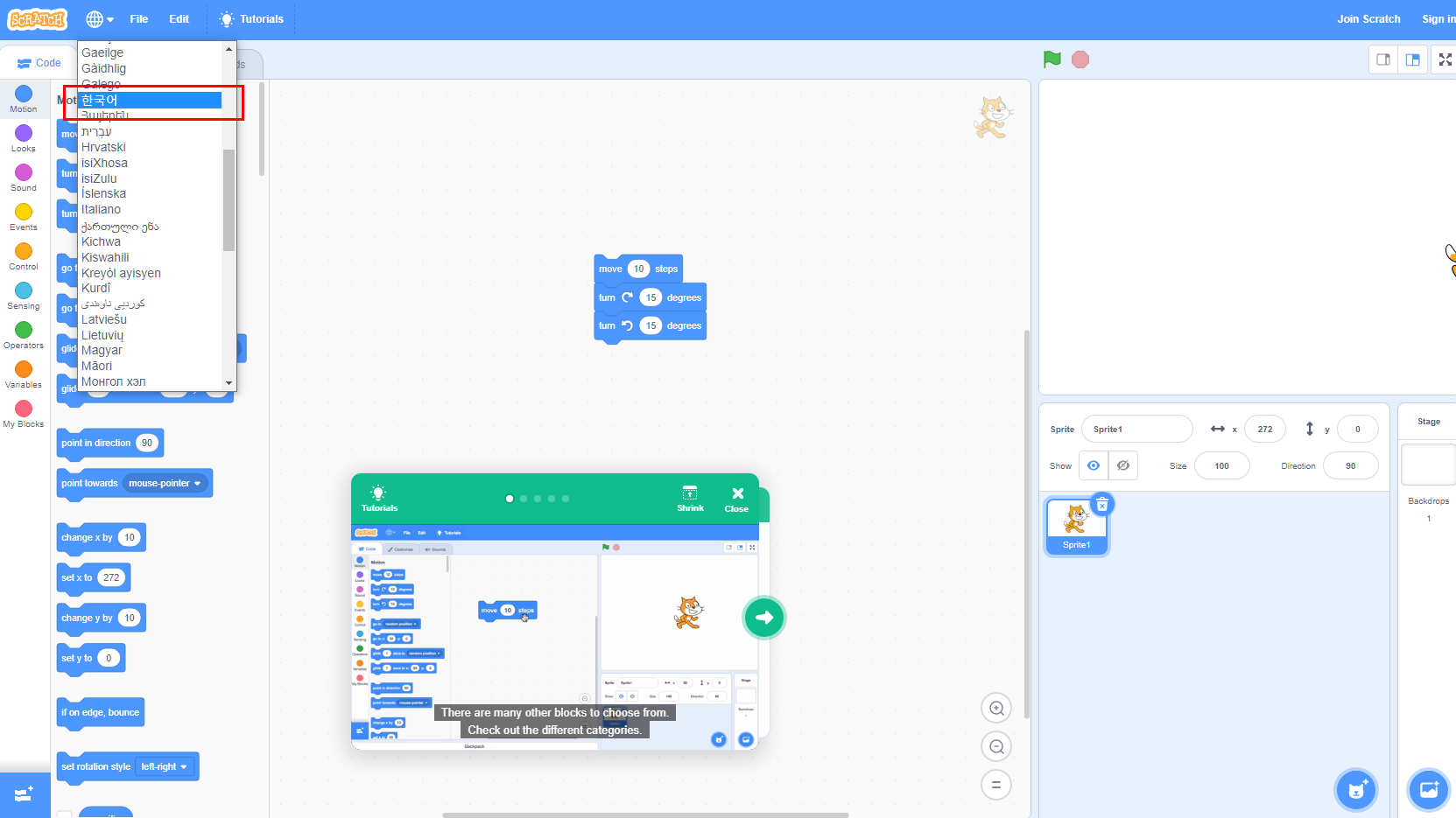 한국어로 변경했으니 이제 스크래치 코딩을 해보자!