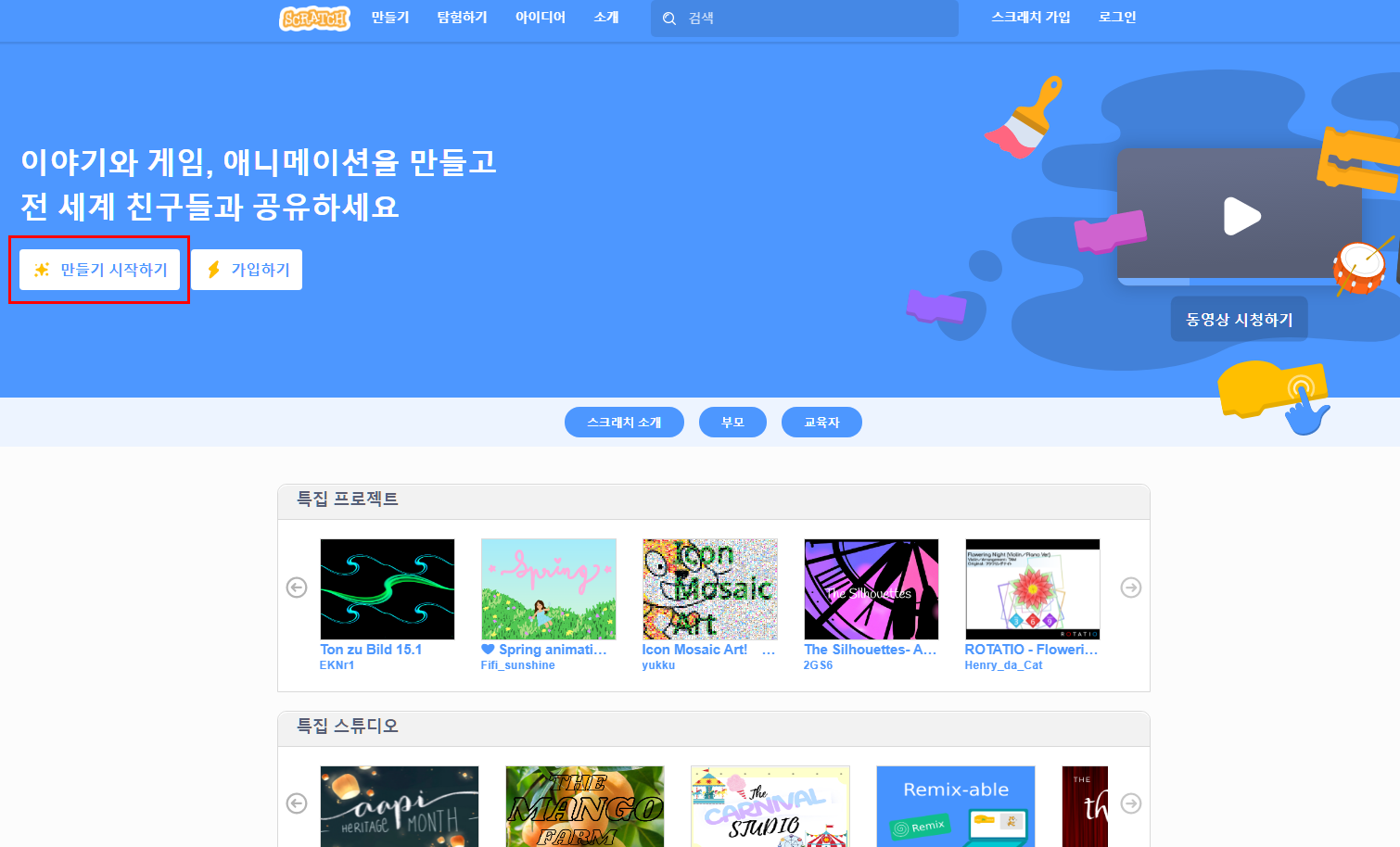스크래치 사이트에 접속하면 아래와 같은 화면이 나타난다.